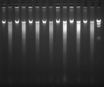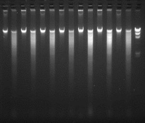 We have purchased equipment funded by Michigan State Univ. to establish a multiuser facility to facilitate high-throughput DNA isolation from samples in a 96 well format. This facility will serve as a resource for the full CucCAP project to prepare DNA for GBS on PI collections for the four cucurbit species. Protocols have been optimized to ensure high quality DNA preparation from cucurbit leaf samples, including both sample collection and preparation steps, and DNA isolation. Each crop team wishing to use the facility will grow the PI seedlings, sample leaf tissue in accordance with the optimized protocols and send the samples to the Grumet lab for processing. Given the extensive numbers of samples to be handled, it is important to ensure optimization, uniformity, and proper sample identity throughout the process. Quality of the DNA is verified according to the standards required by the Cornell Genomics Diversity Facility, including quantification, and gel analysis of uncut and HindIII digested DNA (300-500 ng/sample) as shown here for several cucumber samples.
