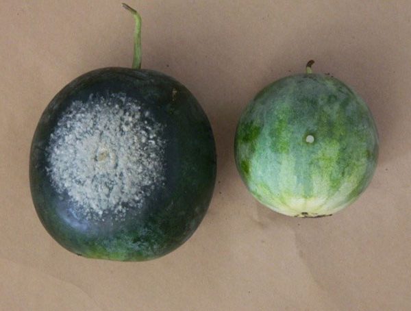 Phytophthora fruit rot resistant line (fruit on the right) developed at the U.S. Vegetable Laboratory, USDA, ARS compared to a susceptible Sugar Baby fruit. image provided by Amnon Levi