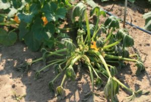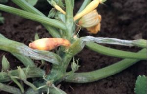 - Arriba, humedecimiento de tallos y fruto inmaduro. Abajo, marchitez de calabaza de verano enferma.