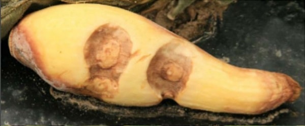 - Lesiones húmedas en fruto, tallo y hojas