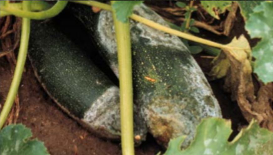 - Arriba, mancha húmeda y esporas blancas en calabaza de verano. Abajo, esporas blancas en calabacín.