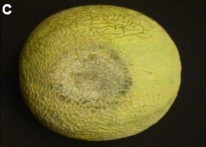 - lesiones húmedas y esporas blancas en fruto maduro de cantalupe